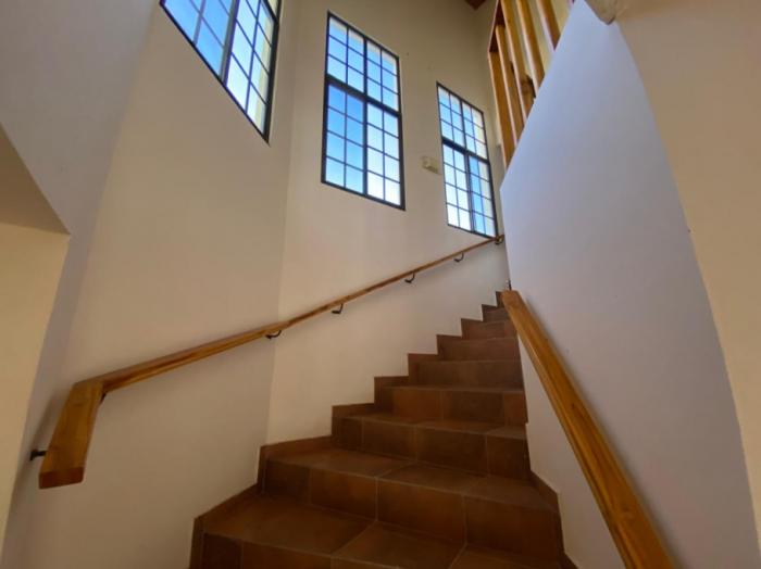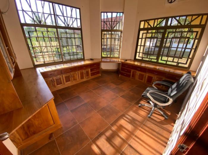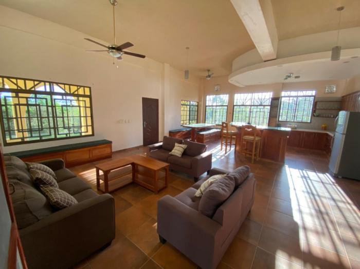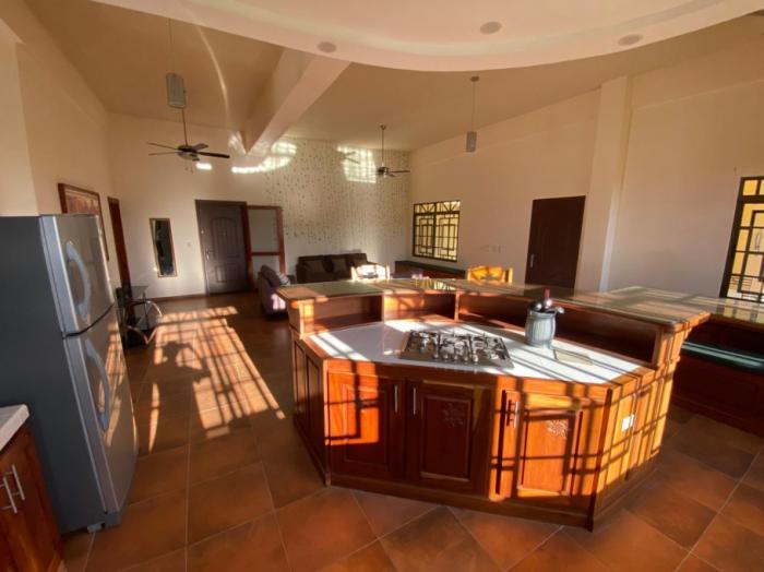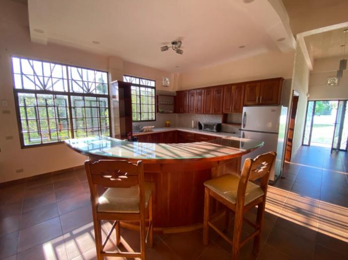 los espacios interiores son amplios y bien distribuidos, incluyendo una cocina grande y abierta, una segunda cocina más pequeña, sala, comedor, oficina, despensa, área de lavandería y cuarto de servicio. la propiedad también incluye un garaje cerrado para dos autos con puertas automáticas.