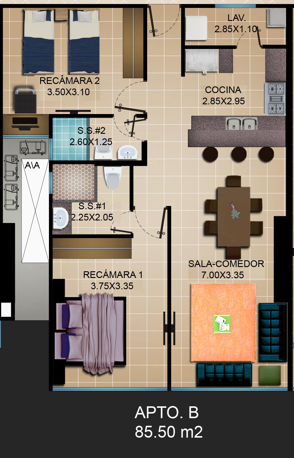 Apartamento con 2 dormitorios, 2 baños, cocina, lavanderia Área social con piscina, gimnasio, salón de fiestas, terraza este proyecto se encuentra en la parte superior de la villa d
