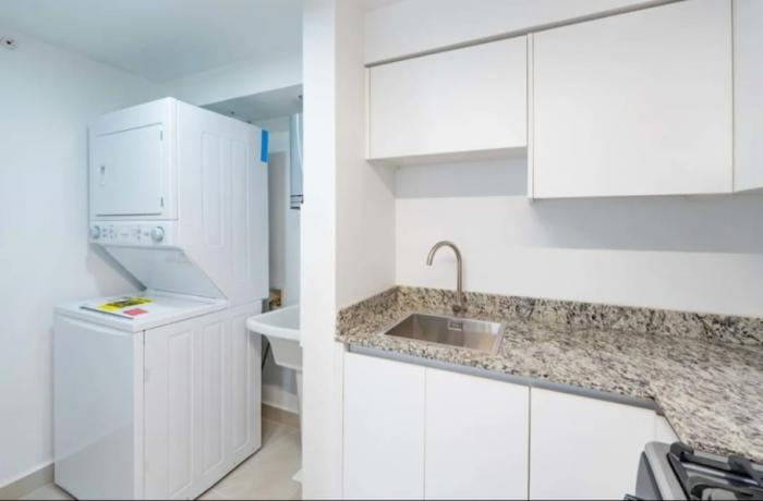 su cocina tipo americano equipada y con acabados de lujo, incluye espacio para almacenamiento en sus amplios armarios empotrados. el apartamento también cuenta con un moderno y elegante comedor auxiliar adyacente a una cómoda sala de estar amoblada, ideal para compartir momentos en familia o con amigos.