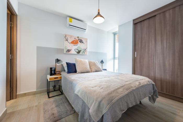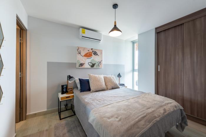 el complejo está conformado por dos torres: la torre 100 lista para ocupar, y la torre 200 en preventa. los apartamentos cuentan con opciones de 1, 2 y 3 recámaras, con distribuciones funcionales que incluyen cocina abierta, lavandería, sobres de granito en cocina y baños, pisos de cerámica importada, puertas de seguridad y opción de balcón. los metrajes van desde los 47 m² hasta los 86 m².