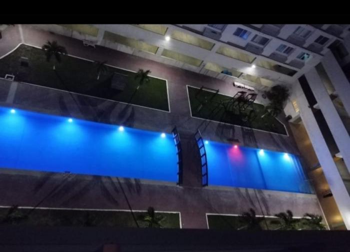 edificio con piscina y ambiente familiar.